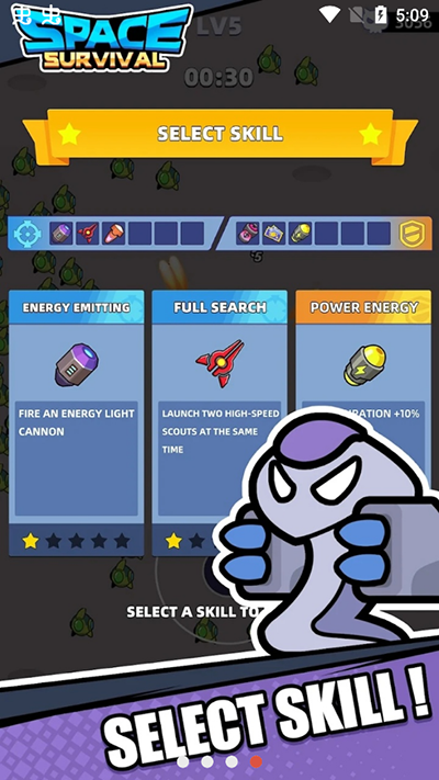 3、消灭敌人后,绿色能量会下降,捡起来会增加经验值,经验值满了可以选择技能。