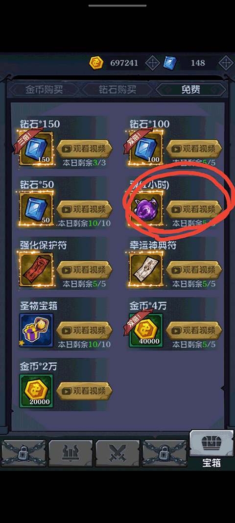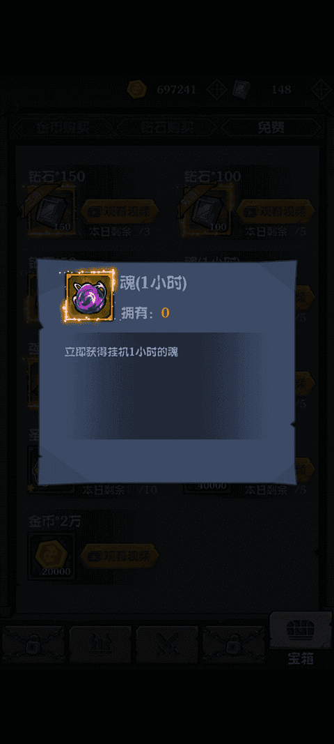 ①在宝箱页面“魂”,游戏里的“魂”是升级所需的经验,使用后可获得相当于挂机一小时的经验值,快速升级。