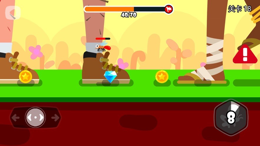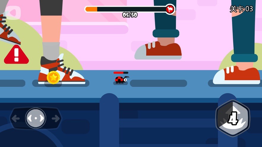 1. 通过控制小虫的左右移动以此达到躲避行人踩踏的目的,考验玩家的反应力与判断力。