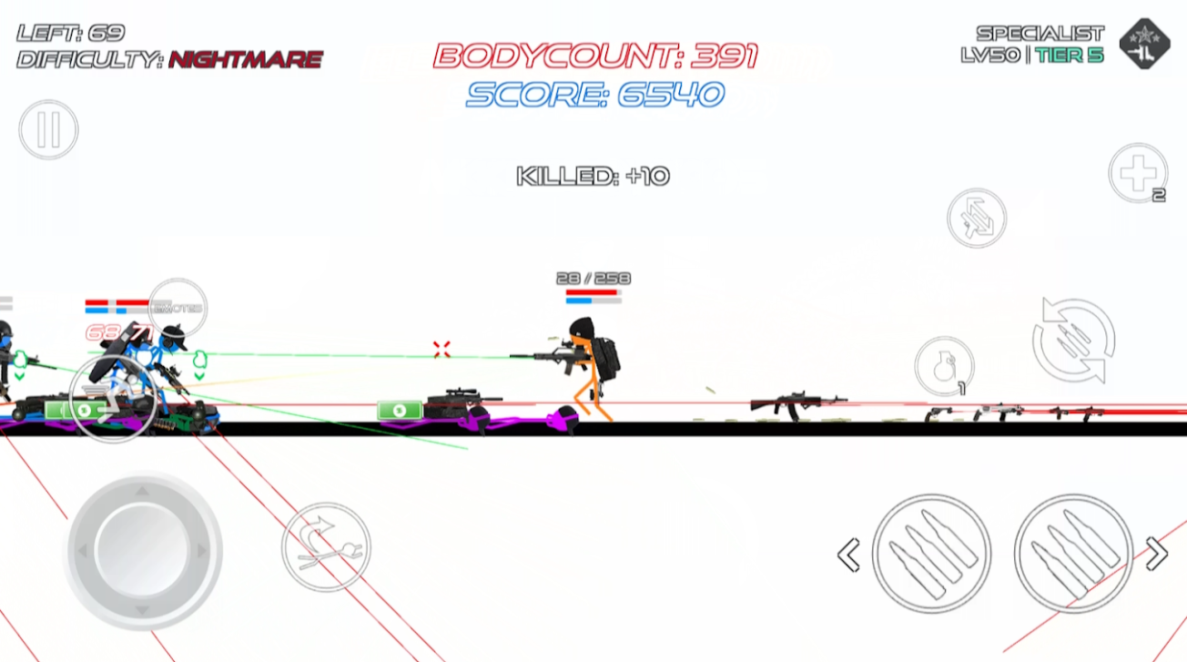 火柴人战争:鲜血打击是一款非常高质量的游戏,很多人都在玩这个游戏。在游戏中,玩家将成为火柴人进行水平射击冒险,瞄准敌人射击,尽量确保他们杀死敌人完成任务而不受伤,并轻松完成任务以获得奖励。游戏中有很多武器和道具等着玩家解锁,也有很多实用的技能可以让玩家学习来提高他们的战斗力,不需要害怕任何敌人。