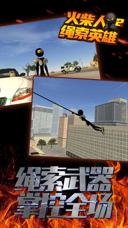 将绳索英雄元素融入其中,玩家在游戏中扮演具有特殊能力的火柴英雄,在城市高层建筑之间行走,消灭各种犯罪力量