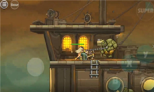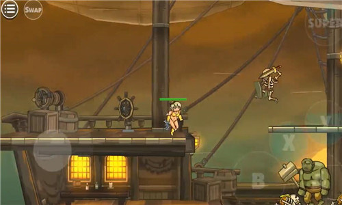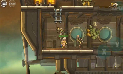 之后,在选择了角色之后,我们将开始我们的职业生涯。使用虚拟遥杆操作,左侧是上下控制键,因为虚拟所以没有显示哦,小化妆玩发现虚拟摇杆真的很神奇,可以用盾牌阻挡自己蹲下,关卡不能与操作分开哦,抵抗各种未知飞行物品的最好方法是蹲下。A是攻击键,B是跳跃键。还有大招的释放,当然是有的CD的。用这些按钮互相结合的操作打怪物再舒服不过了!一开始,怪物会同时从左到右出来。为了避免出血,这取决于操作之间的合作。你可以跳到一边攻击,也可以快速攻击左侧,然后攻击右侧。速度是一切的前提。