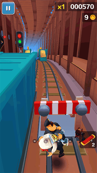 跳到路障上方,踩在路障上进行第二次跳跃,可以直接跳上火车。这种技能对距离控制要求高,难度大,自然要长时间运动。