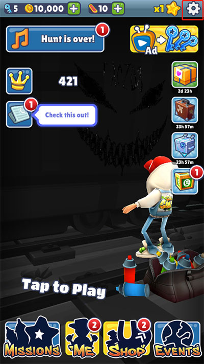 1、双击打开地铁跑酷沙漏版游戏,点击右上角的齿轮图标。