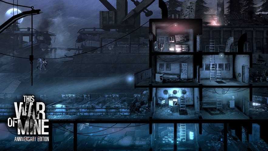 这是我的战争游戏,是一款改编自真实事件的游戏,灰色风格的游戏图片,在废墟中寻找食物、水和其他生存材料,第一人称视角,引导玩家体验真实的战争环境。