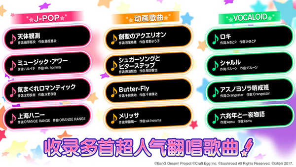 5、在歌曲内容方面,游戏不仅包含了大量全新的原创歌曲,还包含了玩家熟悉的ACG曲目乐队翻唱版。