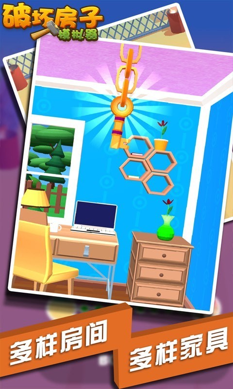 破坏房子模拟器是一款非常好玩有趣的休闲益智类手游,游戏玩起来非常解压,玩家在游戏中的目的只有一个,就是要不停的破坏关卡内的各种家具,游戏为玩家提供了多种不同的游戏道具,玩家可以自由选择工具来使用,同时
