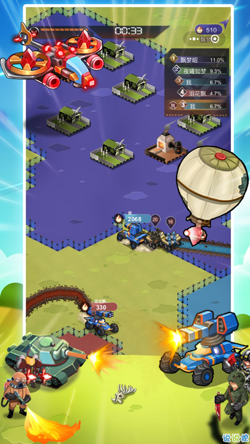 -五个兵营、五个定位、近战士兵、喷火口兵、机关枪支、坦克、飞机不断升级进化,以25种有趣的兵种为单位,提高战斗力,展现新鲜真实的战斗体验。
