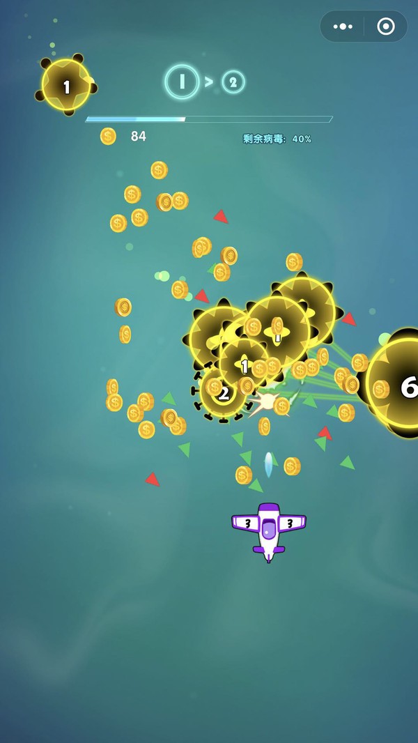 1、在挑战中,你会看到显示不同数字的病毒。如果射击消除一个,你会得到与上面数字相同的金币。
