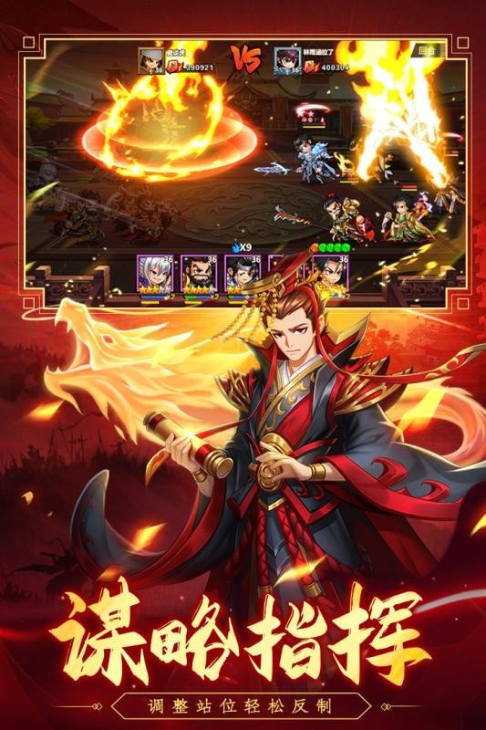 武将分魏、蜀、吴、群雄四个阵营,又分力、智、体三个类型,根据不同的技能特效又有更多的划分,百位武将搭出无限可能!通过调兵遣将,选出你的理想阵容,调整站位,排出阵型,享受策略致胜的独特快感!