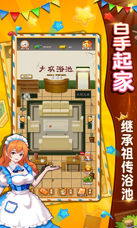 大众浴池游戏是一款非常休闲的模拟经营类游戏,在这里玩家经营着一家大众浴池,作为旗下唯一的产业玩家需要不断的扩大生产规模,并且提升浴池的设施来提高档次,在扩建过程中也要一步一个脚印不要做危险操作。