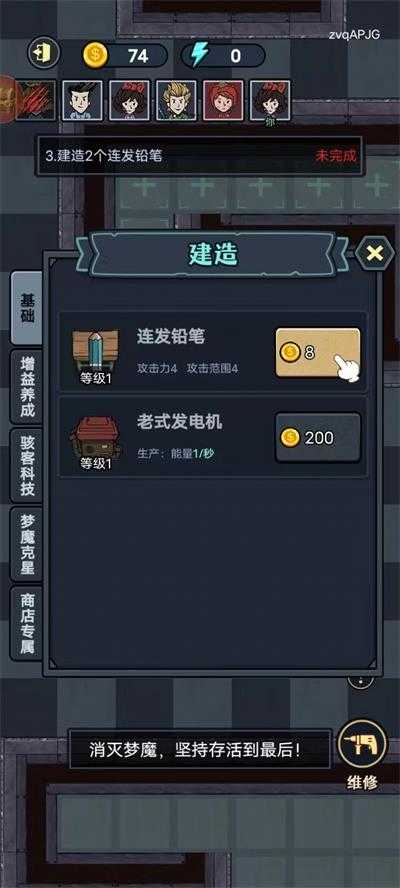 7、点击房间的开放空间,可以建造连续铅笔或旧发电机;当噩梦来临时,可以攻击旧铅笔;因为随着游戏的进行,噩梦会越来越强烈,玩家需要不断升级旧铅笔和大门来击退噩梦;