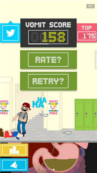 呕吐大战是一款以恶搞为主题的休闲趣味游戏。游戏中,玩家将扮演一名闹肚子的学生,利用呕吐物与各种敌人战斗,玩法简单有意思,但要注意的是你胃里的东西会吐光的,一定要记得补充存货。新奇简约的画面,简单易上手的操作,极其恶搞的风格,结合奇葩的游戏方式,让玩家不知不觉的沉迷在这款魔性的游戏里。