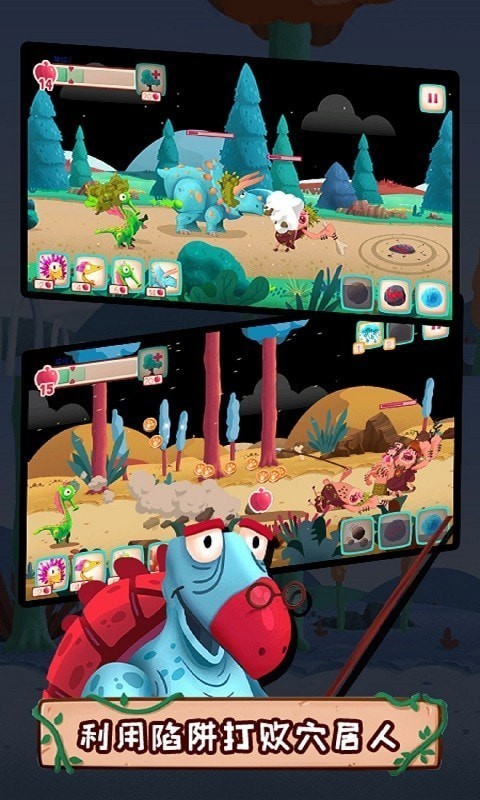 荒野生存战是一款以卡通风格制作的奇幻刺激生存塔防手机游戏。玩家需要在游戏中保护恐龙。荒野生存战斗游戏的操作非常简单。玩家只需要把恐龙放在原始图元可见的地方。玩家需要考虑很多方面,因为恐龙在显示时会自动攻击这些图元。当原始图元出现在恐龙的攻击范围之外时,原始图元会利用间隙。