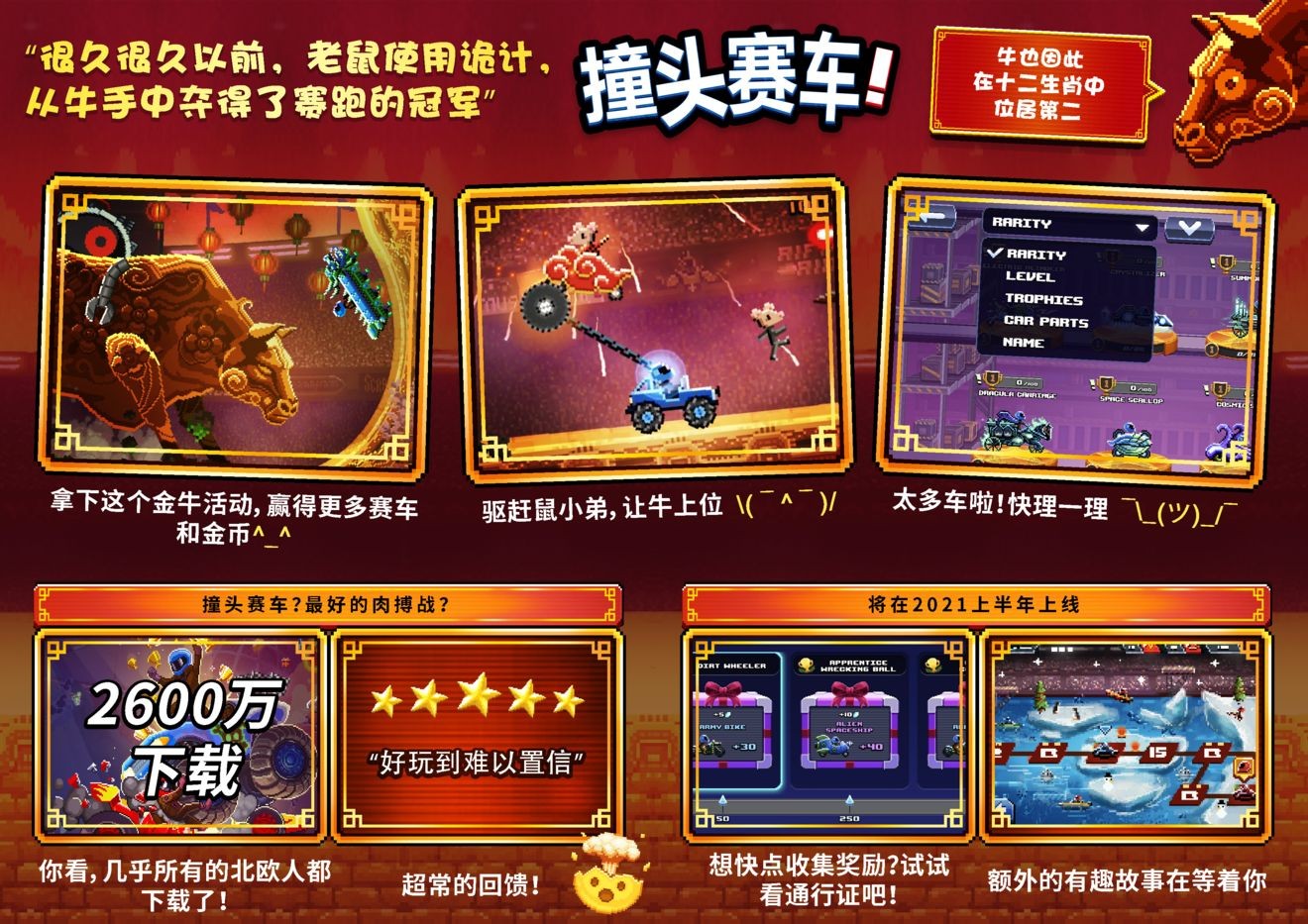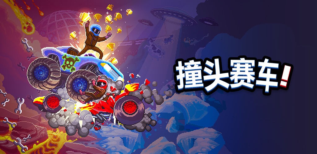 真男人就来拼车,撞头赛车来了,下至儿童车,上到撞头赛车、外星飞碟,宇宙飞船车等等,撞头赛车游戏需要用不同车辆重击朋友的头盔来打败对方, 有没有叠帽子游戏的熟悉感?运用上百种车辆花式打碎头盔,还等什么,