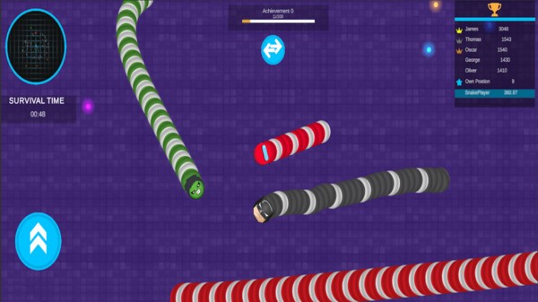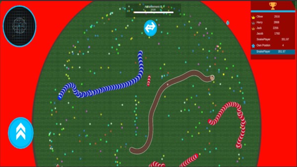 1、控制摇杆移动你的蠕虫,吃地图上的彩色小圆点,它会变长。