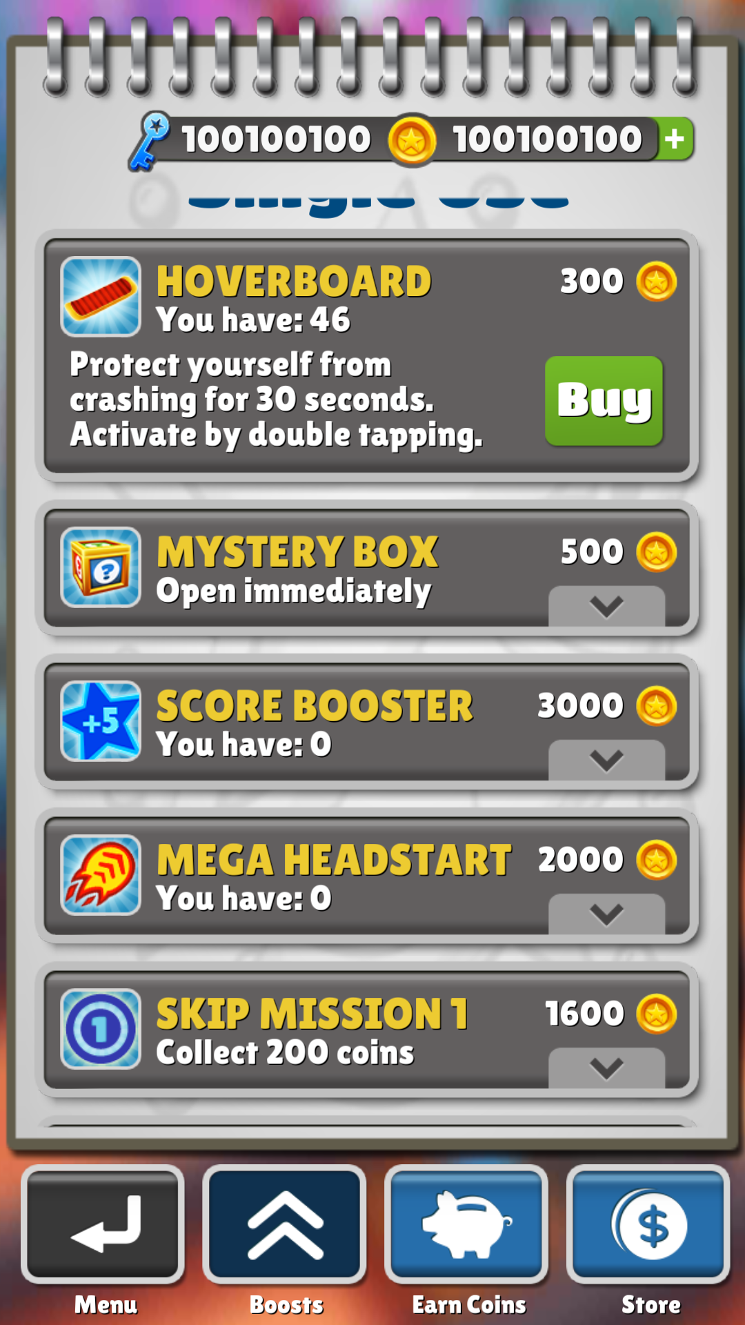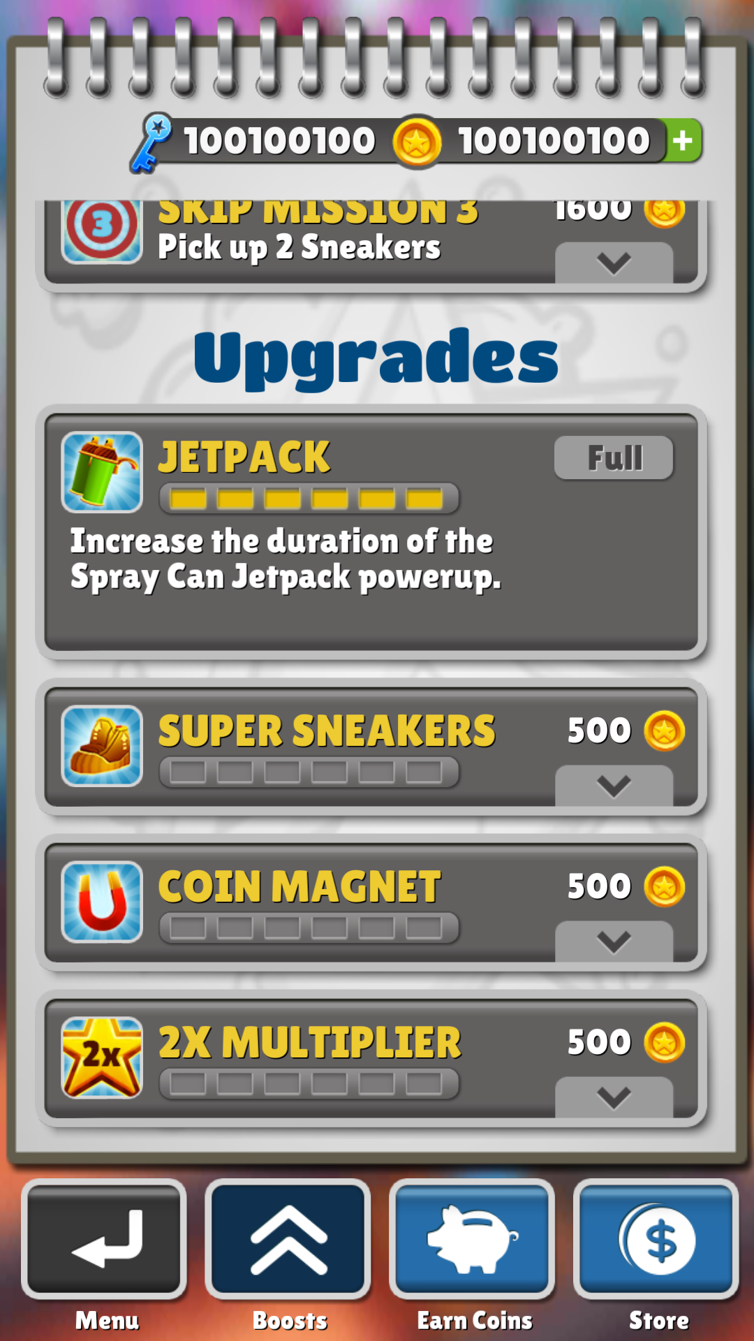 2、商店可以购买技能和道具。玩家会在游戏中收集很多游戏币,可以利用这些游戏币在游戏店购买技能和道具,主要包括加速、磁铁、滑板等。