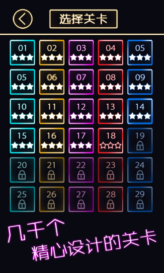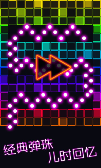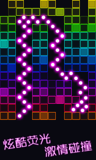 3、酷炫的荧光界面设计为玩家提供了丰富的关卡。玩法简单有趣。游戏采用物理弹射原理,粉碎更多砖块,全部消除即可成功突破。