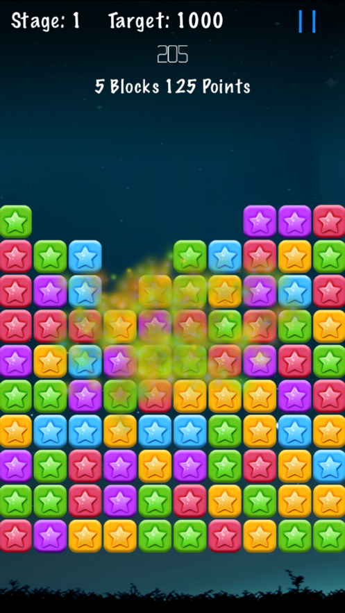 [经典模式]单击任何一颗恒星,只要有与该恒星相连的同一颜色的恒星,它们就会同时被消除。同时,消除的星星越多,得分就越高。