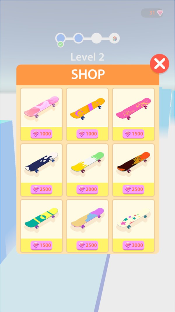 3、解锁更多不同类型的滑板,每个滑板的性能都不一样;