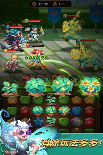 4、休闲三消与传统回合制的奇妙融合,既有消除突破的淋漓尽致感,又有经典战役的战略应战!面对强大的对手,你可以充分发挥,发挥聪明的消除技巧,击退敌人;你也可以仔细考虑,通过安排和运用技能获胜