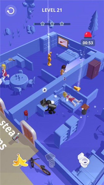 3.强大的道具系统:在游戏中,玩家可以积累和使用各种道具,如烟雾弹、无声鞋等,帮助自己更容易地完成抢劫任务。
