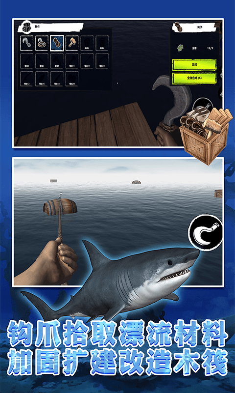 木筏求生者游戏是一款非常有趣的荒岛模拟生存类游戏,在游戏中玩家因为一些意外而流落荒岛,刚开始的时候身边只有一个小木筏,玩家通过自己的一双巧手来搜集各种能够使用的物资,帮助自己来制作能够用到的工具顺利生