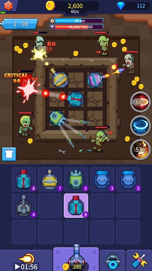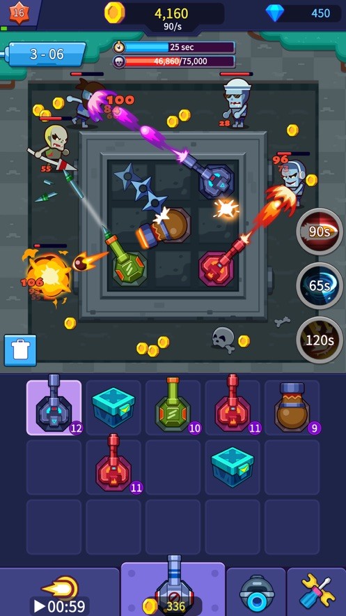 1、炮台守卫战,合成挂机打怪,周围一波又一波魔物准备动,来打僵尸吧;