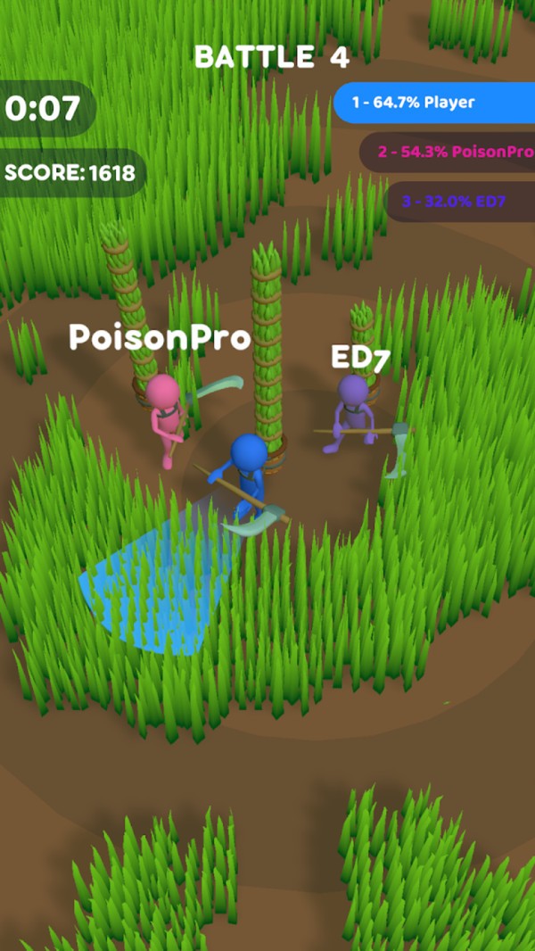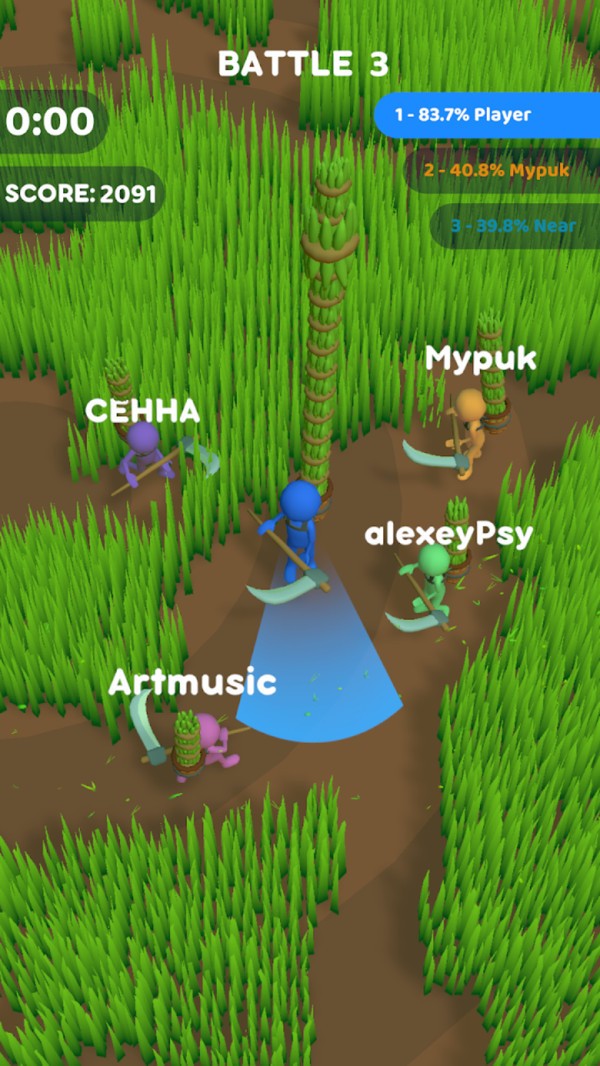 割草大乱斗游戏是一款非常有趣的割草大乱斗游戏,在游戏中的土地上都是杂草丛生的,玩家需要和不同的玩家来一起争抢有限的地盘,将草割干净的地方就全都是你的地盘,所以玩家是动力满满并且也要提防其他玩家来你这里