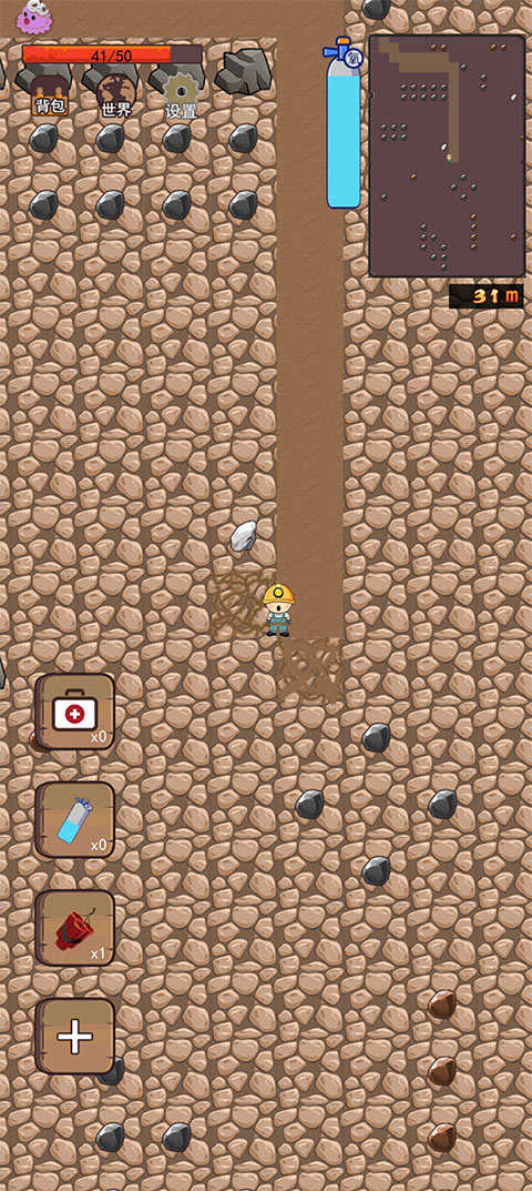 挖掘出来的矿石将储存在背包中。如果包裹满了,你需要回到地上,去食堂卖掉所有的矿物,你也可以在食堂存档游戏。
