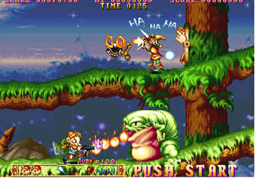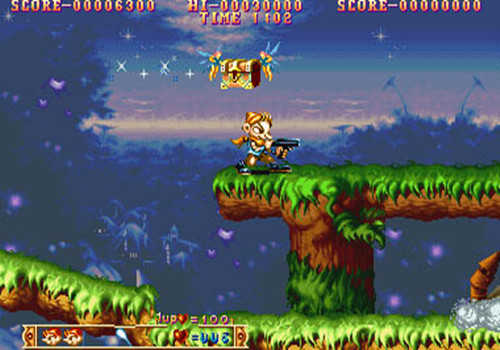 1、首先是第一个动作射击游戏,也叫陆地篇。玩家操作的角色是一个长耳朵的精灵,可以跳跃、突进、射击。主要场景是森林、城堡等。在这个游戏中,你只能攻击两次。第一次攻击会爆衣服,第二次直接死。在这个游戏中,你可以吃各种道具,其中宠物是最好的。