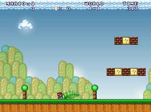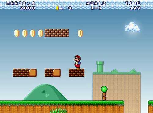 当正式开始游戏后我们看到那些带有问号的金砖,这时可以按跳跃键获得奖励,在游戏中我们会遇到一些水管,这时我们可以跳上去再按方向键“下”,会有水管能带你进入水管的世界中,里面可是满满的金币;当我们遇到比较远的障碍物时,我们可以按住方向键+Z键(系统默认)进行快速奔跑,然后再按跳跃键,就可以越过那个障碍物了。