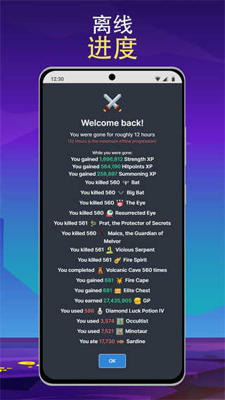 3、除了20多项可升级技能外,游戏还具有离线进度、兼容云保存功能、内置仓库/库存系统等功能!由于不断稳定的更新,您的冒险将永无止境。