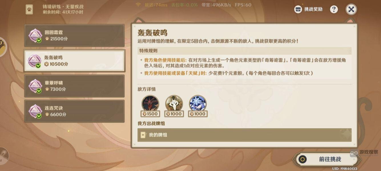 本关适合使用三色队,通过利用关卡buff打出三次三费技能,通关方法莫娜/纯水+草神+菲谢尔/刻晴等,或者下图的纯激化阵容。注意敌方伤害较高,被打出反应可能撑不到五回合,所以尽量规避反应。